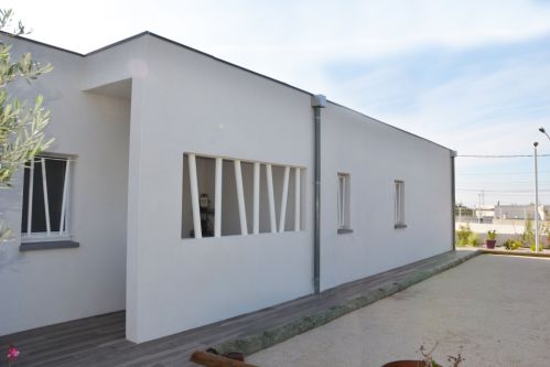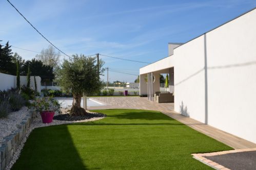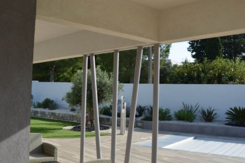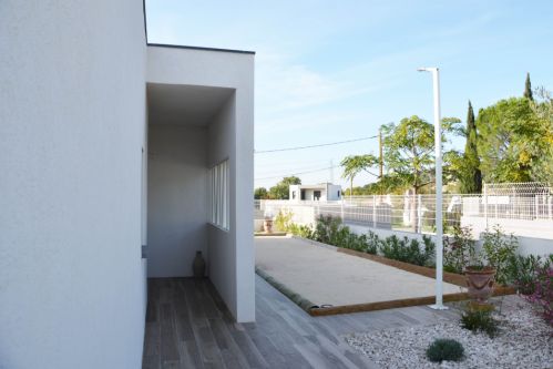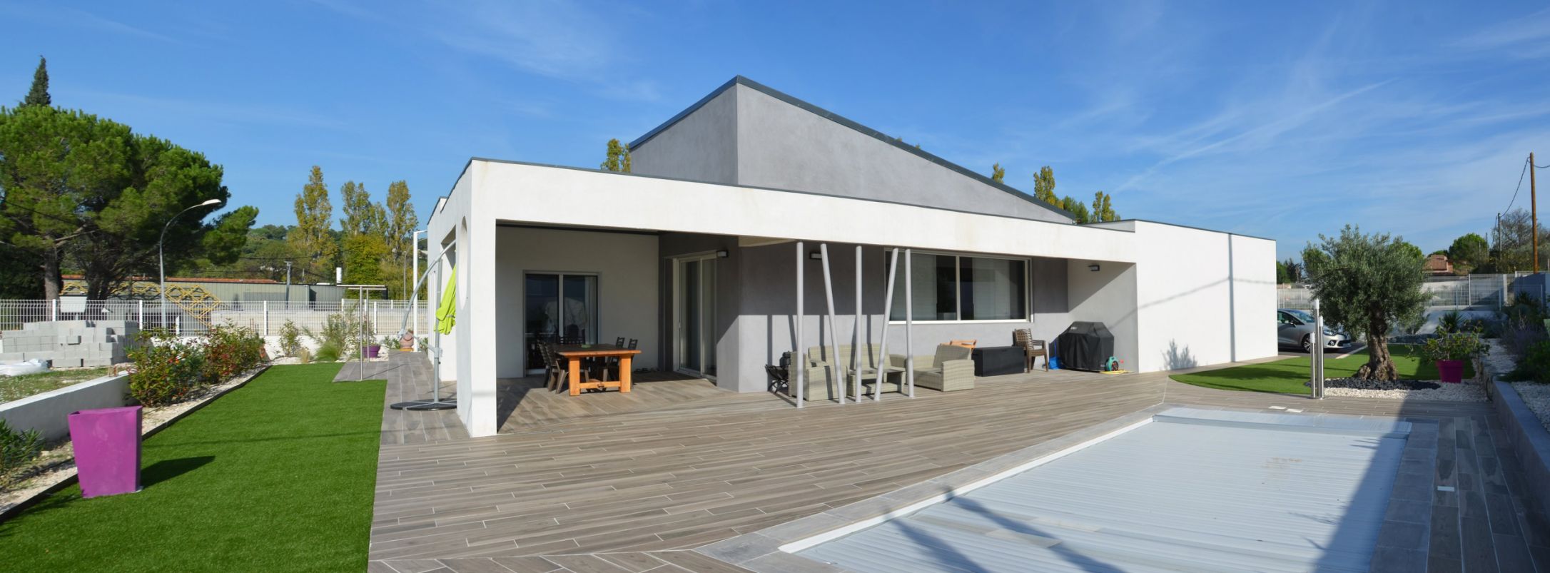 Au Sud, une piscine sera aménagée par une terrasse qui viendra à la jonction des deux volumes d’habitation.