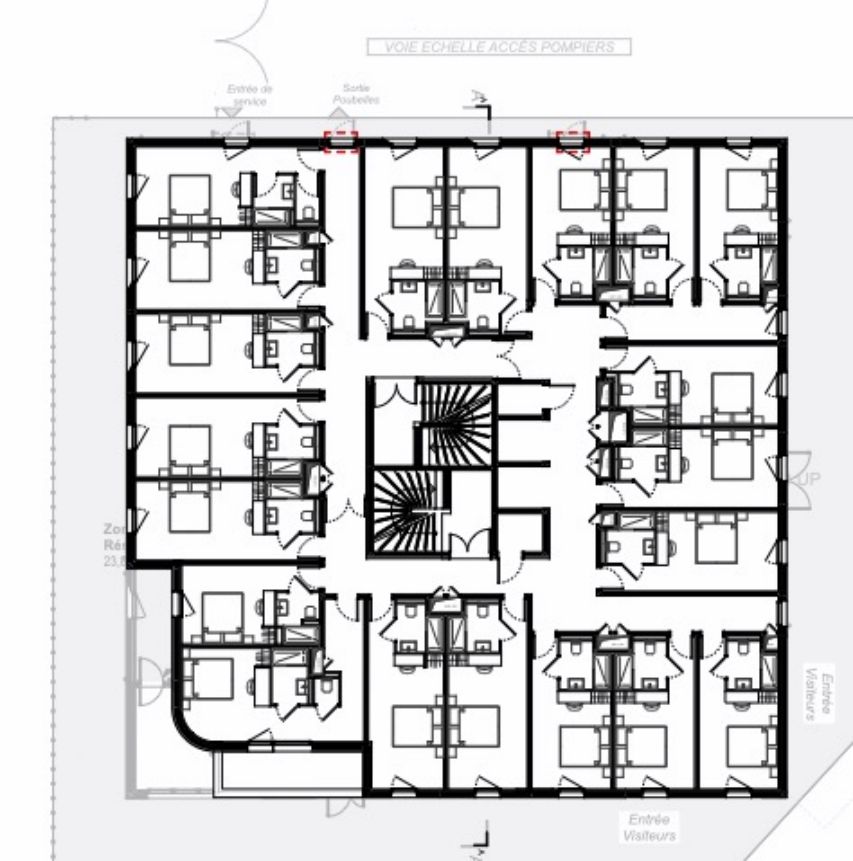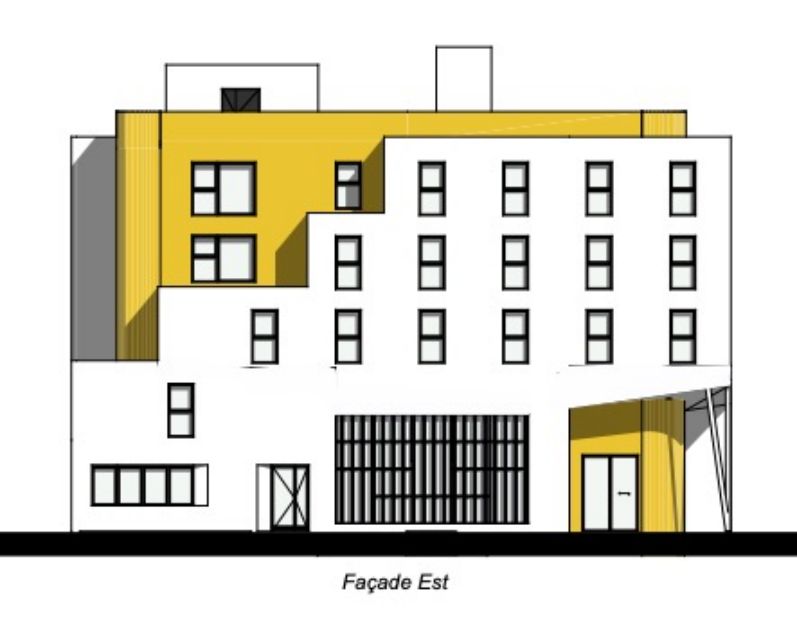 Dernier bâtiment d'un ensemble de bâtiments d'activité, l'hôtel vient en fond de parcelle et culmine de sa hauteur comme un phare. Sa couleur en est le témoin. Ce bâtiment, en R+4 est ainsi le point d’orgue du projet.