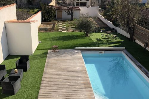 La piscine est implantée dans le prolongement du volume de l’étage, ce qui permet de retrouver une cohérence en plan sur l’ensemble du projet.