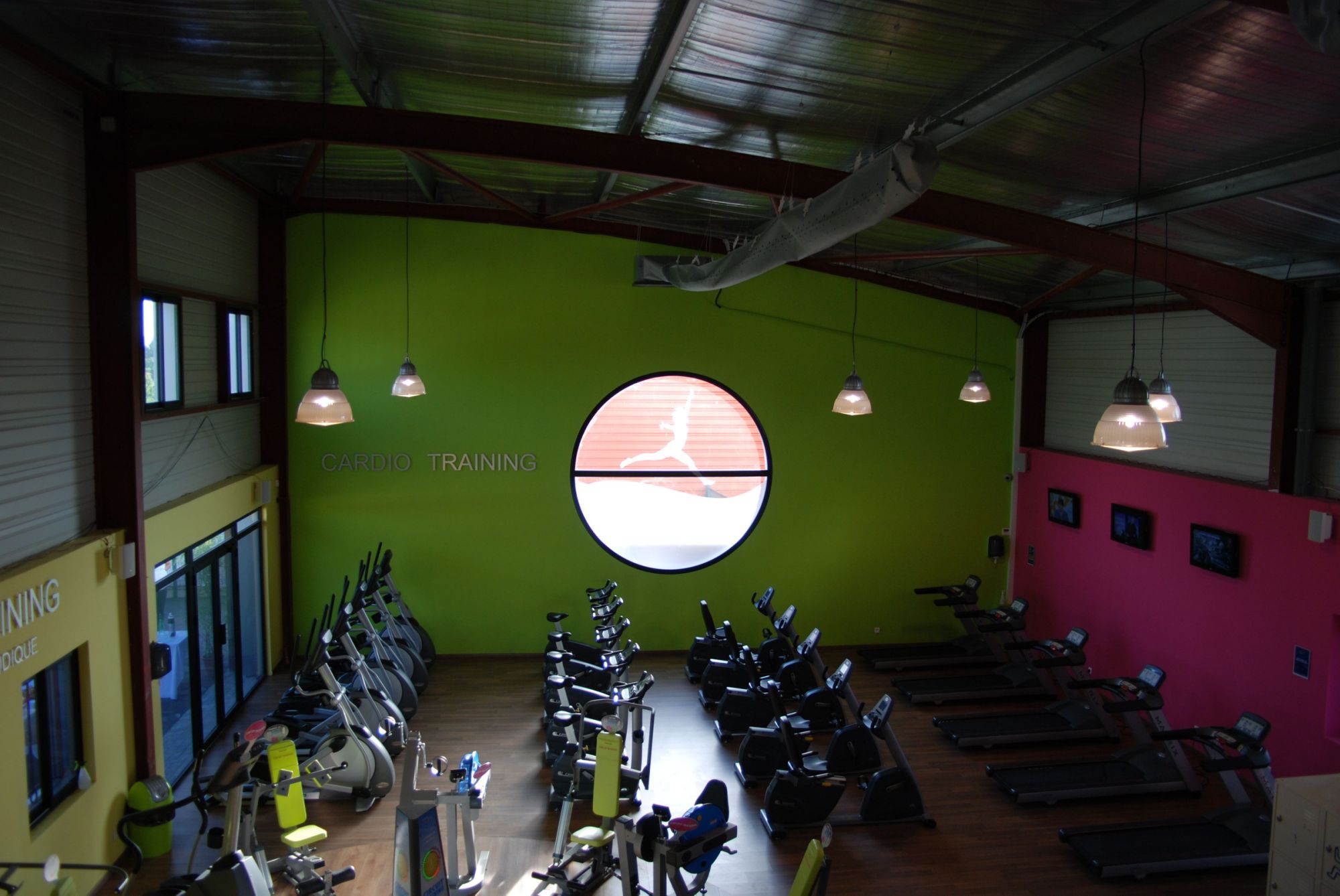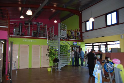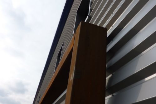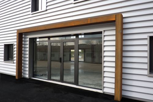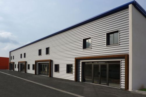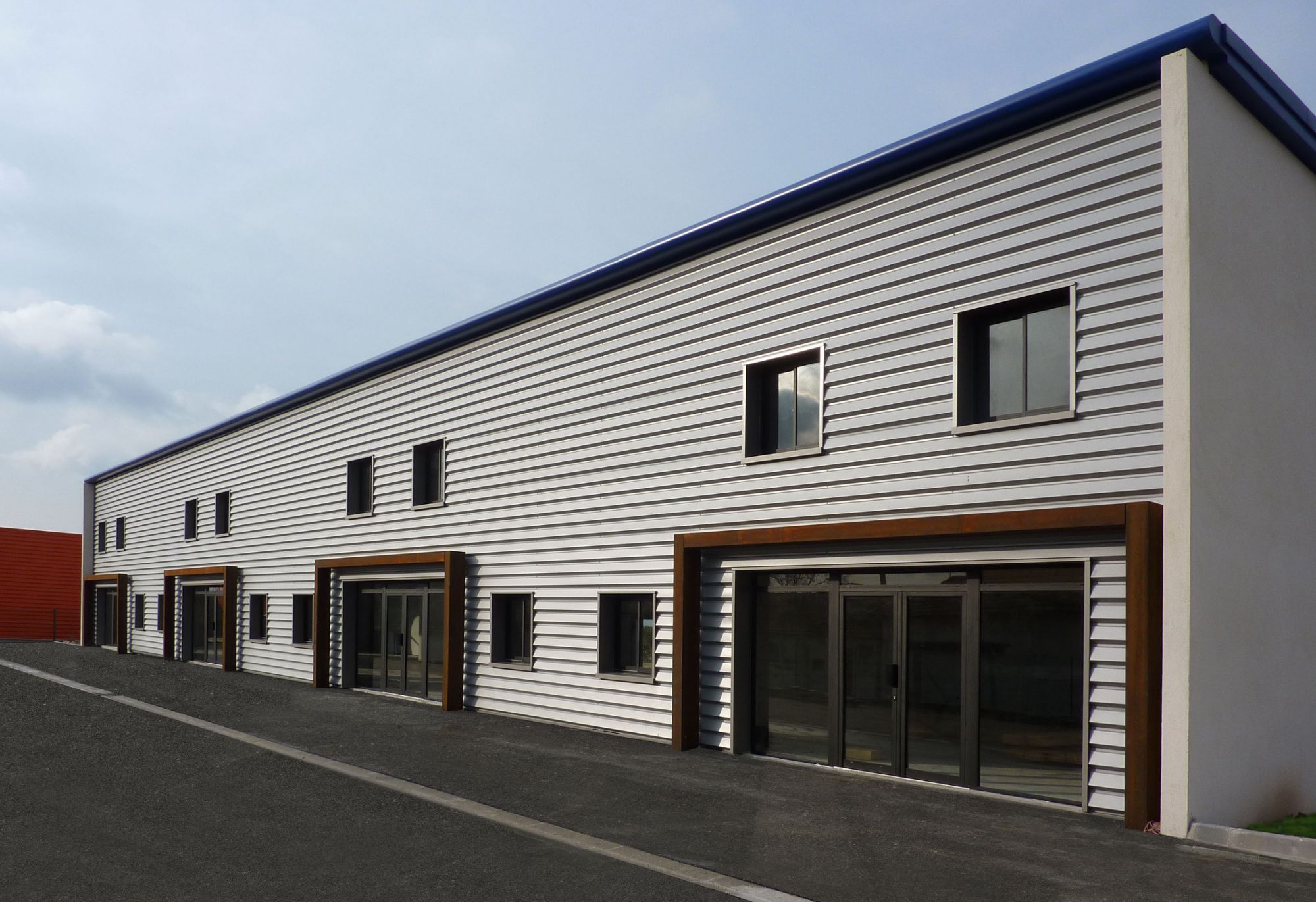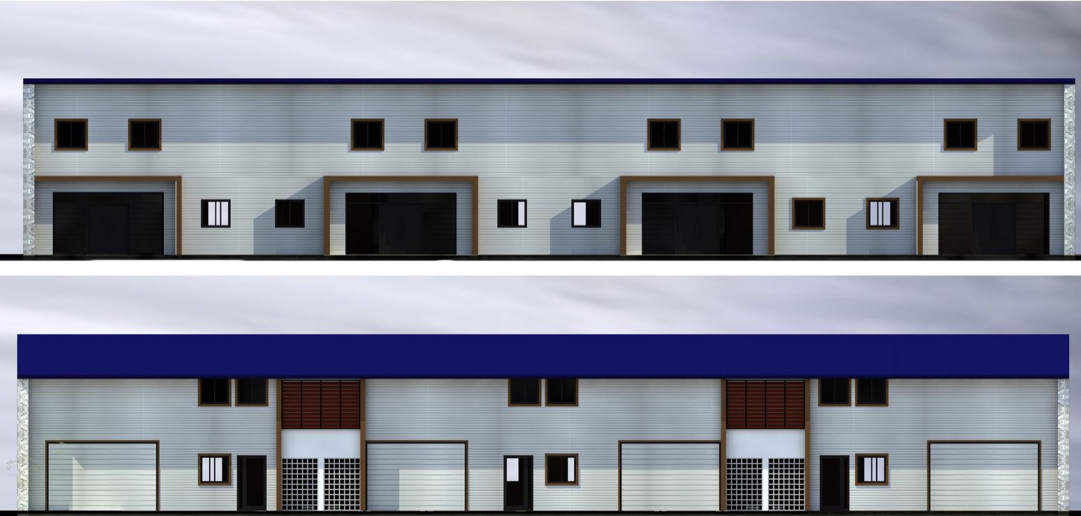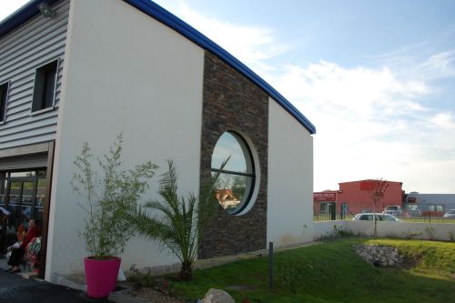 La façade Nord habillée de bardages métalliques comme celle au Sud comprend deux parties maçonnées vitrées par des pavés de verre éclairant les zones de services.