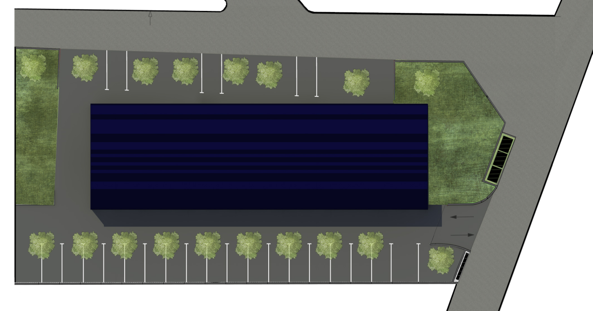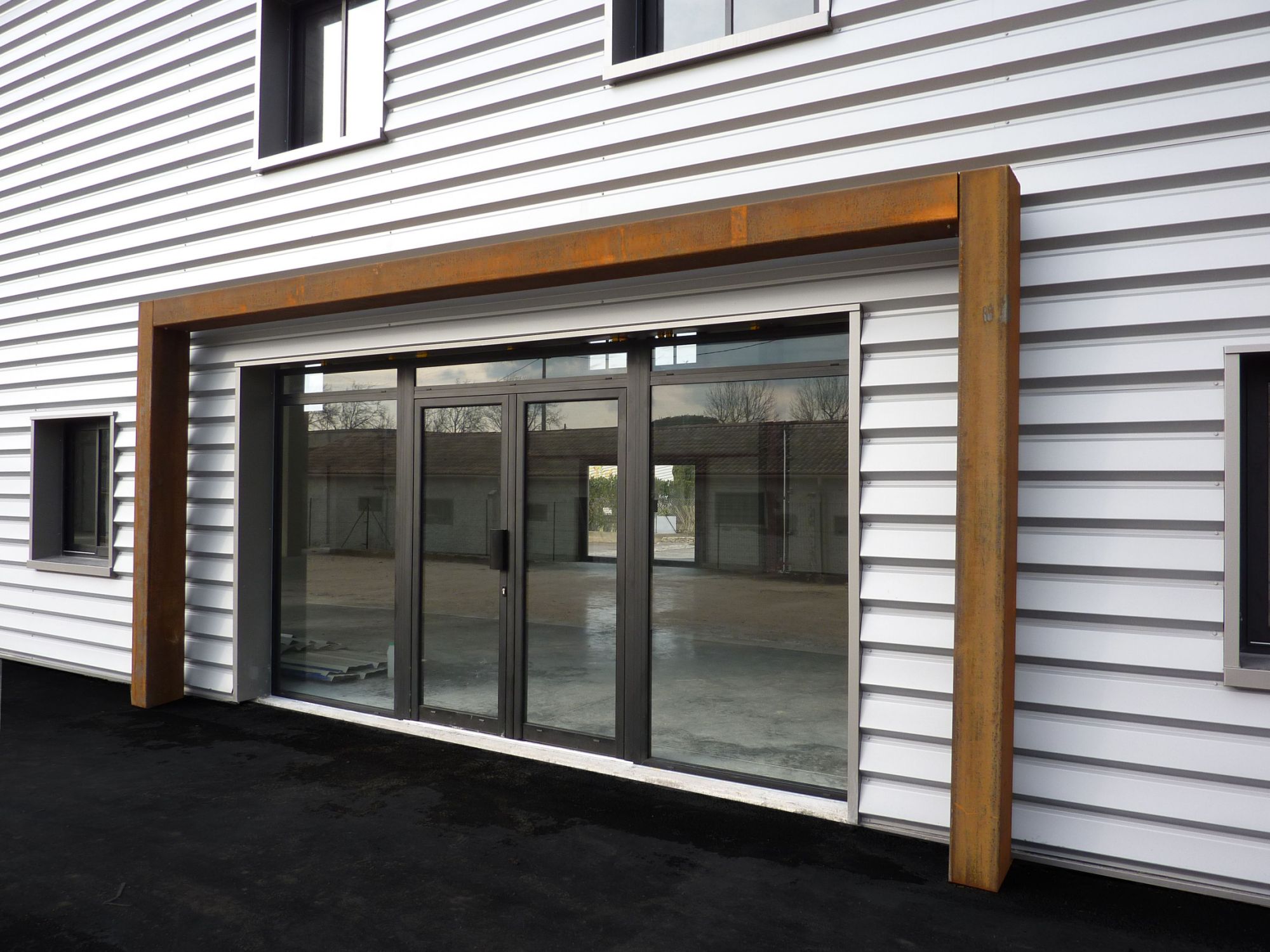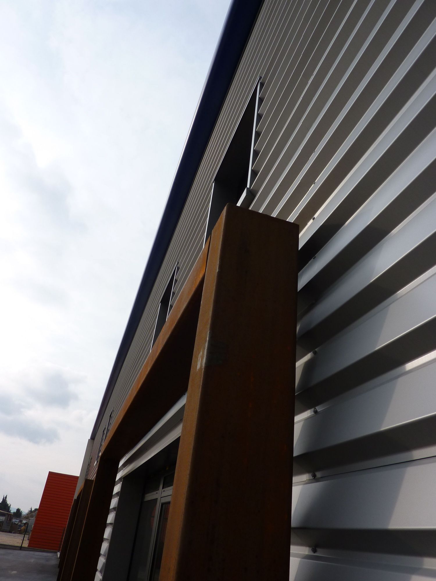 Ces éléments verticaux situés au 2/3, 1/3 des travées recoupent les bardages métalliques horizontaux et créent ainsi une rythmique de façade intéressante. Les portes sectionnelles d’accès destinés à la livraison des marchandises sont signalées, comme la façade sud, par des volumes maçonnés saillants par rapport au nu de la façade formant portique.