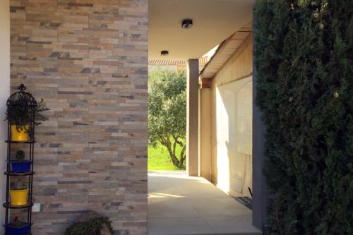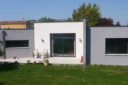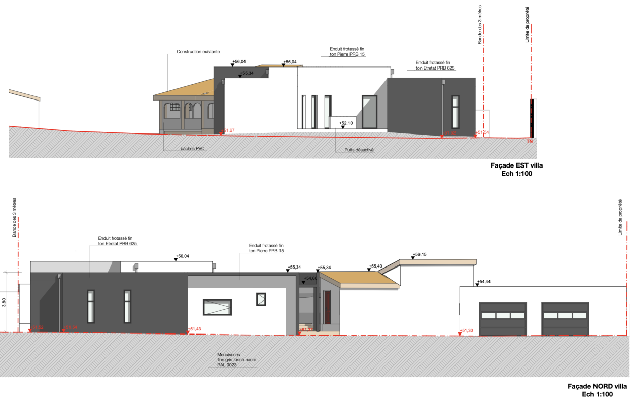 Des casquettes viennent ponctuer la construction sur les façades Nord et Ouest. Celles-ci ont pour vocation de protéger contre l’ensoleillement ou bien d’abris notamment au niveau de la porte d’entrée.