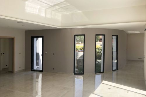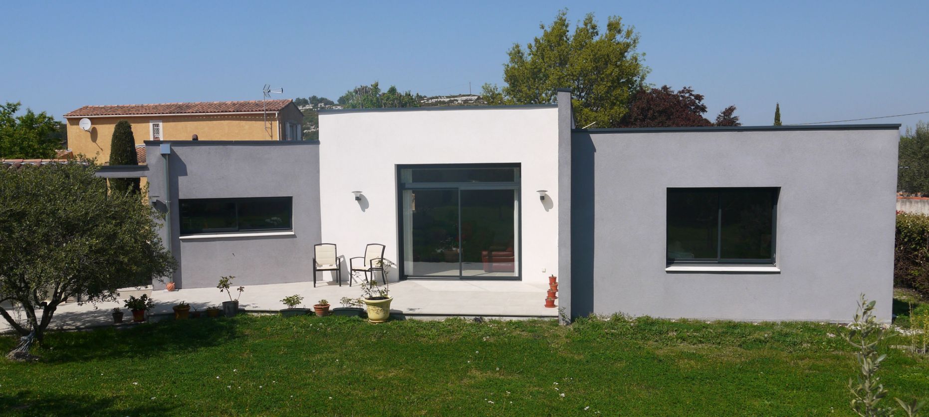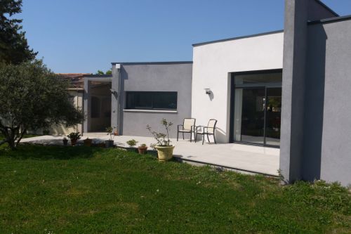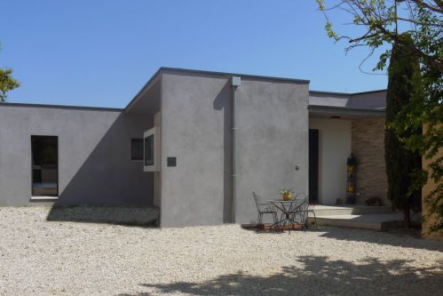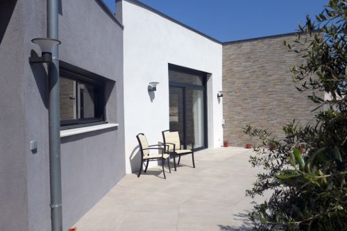 Les volumes sont organisés de manière à créer différents espaces extérieurs (entrées, terrasses …). Le volume principal accueille les espaces de vie communs tels que le séjour, la cuisine et le bureau. Cet espace traversant d’Est en Ouest se développe autour d’une terrasse qui met en scène le puits.
