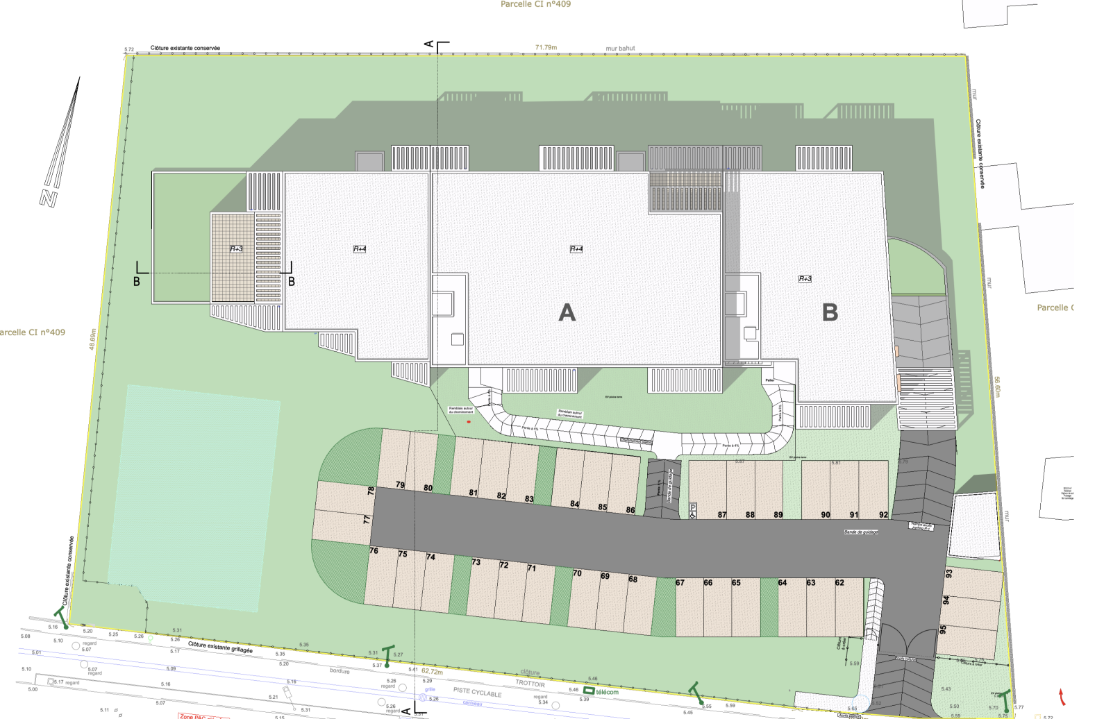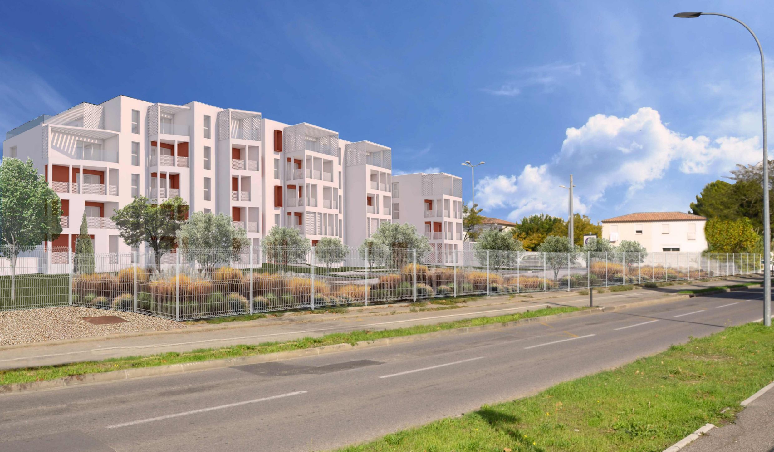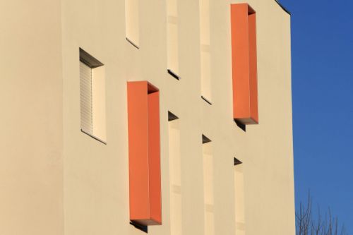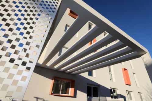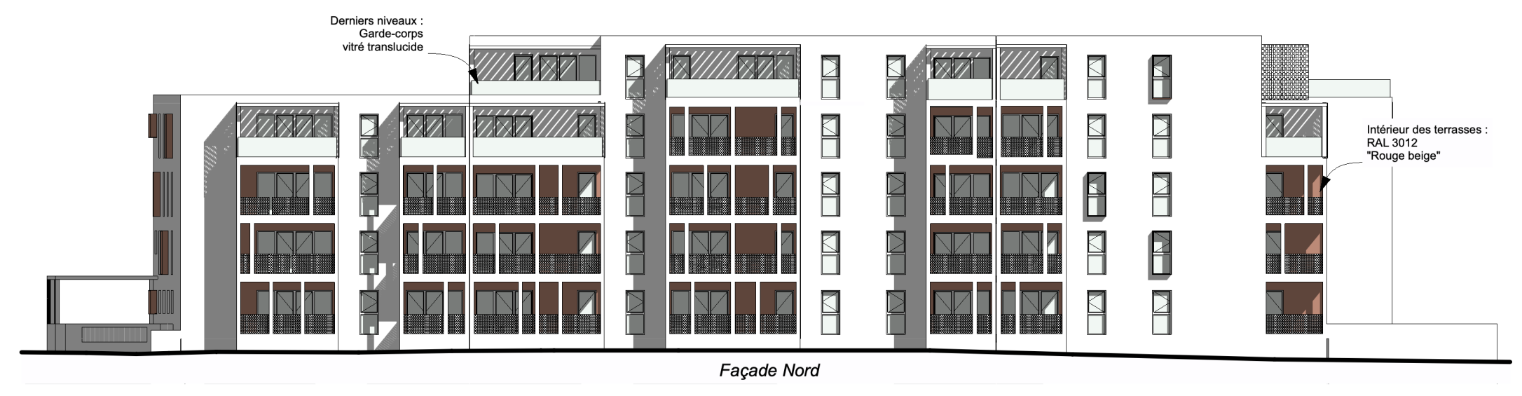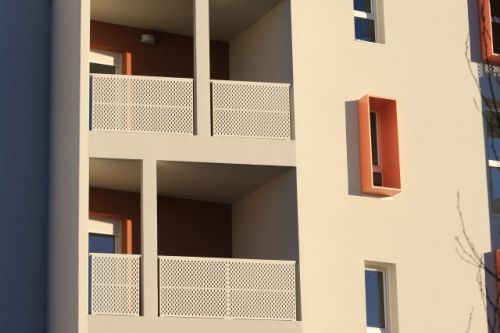 La couleur des balcons s’inspire de celle du gymnase et du lycée voisins dans le but de créer un lien, d’ancrer profondément ce nouveau bâtiment de logements dans son environnement proche. Les garde-corps en serrurerie blanche accentuent le jeu de pleins et de vides sur la partie balcon. Les derniersniveaux sont allégés de par l’arrêt de la structure béton rythmée des balcons des étages courants pour laisser place à des pergolas ajourées et à un jeu de transparence avec des claustras. Ces derniers empêchent les vis-à-vis d’un balcon à un autre. Les garde-corps des derniers niveaux se voient aussi modifier afin d’accentuer l’effet d’attique.