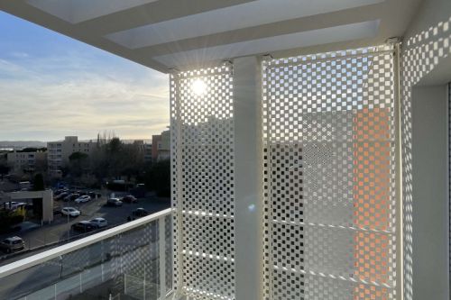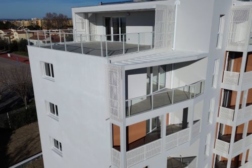 Les casquettes béton situées aux derniers étages sont ajourées dans le but d'alléger les attiques du bâtiment et d’apporter un confort d’été pour éviter les trop fortes chaleurs dans les logements.