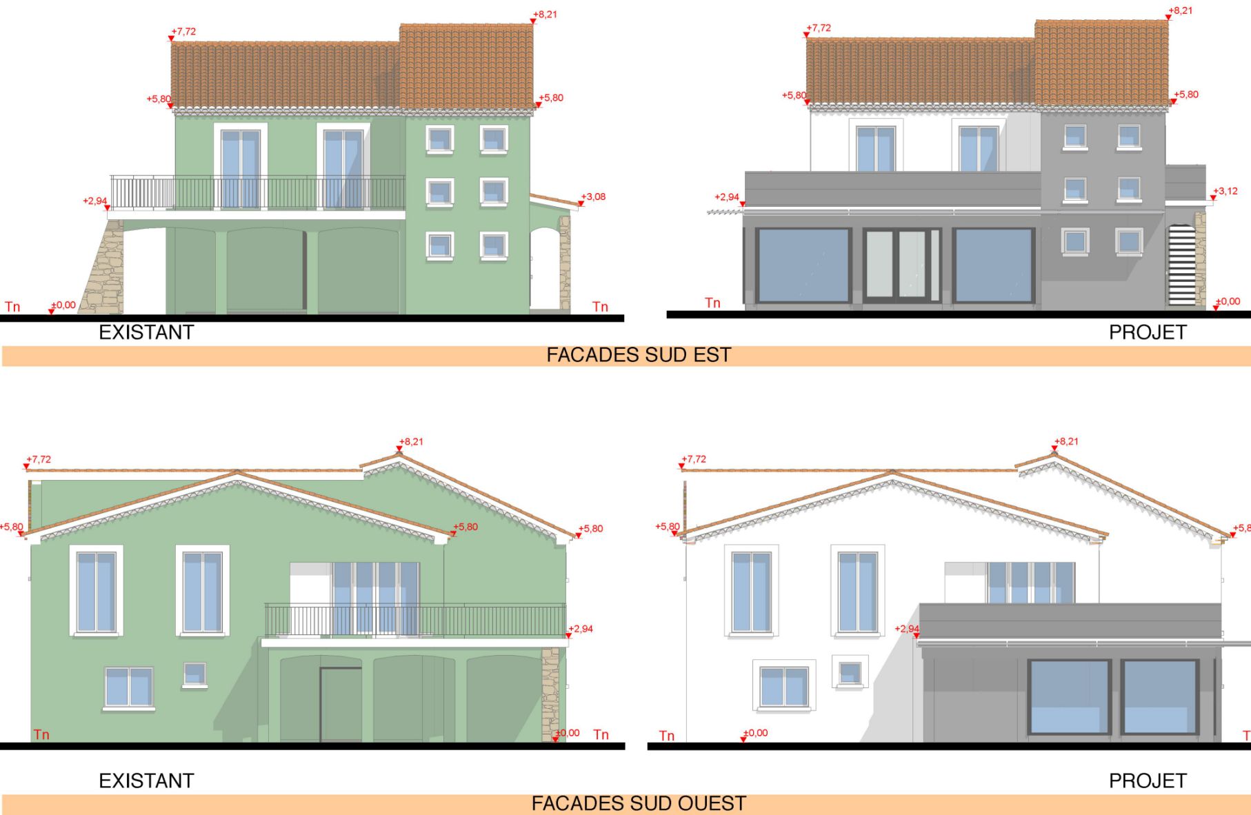 Les teintes des enduits de façades seront changées. L'actuel «Vert d'eau» de la maison est remplacé par un blanc pur à l'étage et un gris moyen en RDC. Une différence significative de notre volonté de mettre en avant l'agence par une couleur plus sombre.
