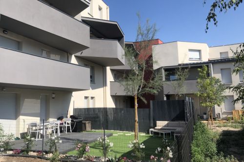 • des bâtiments B et D est fractionné en deux par un espace dédié aux deux roues et qui permet également un accès aux espaces verts communs. Les cages d’escalier sont grandement vitrées toute hauteur et assurent une transparence de l’édifice. Ceci crée une mise en relation visuelle entre les espaces de parking et d’accès aux immeubles et l’arrière dédié aux espaces verts.