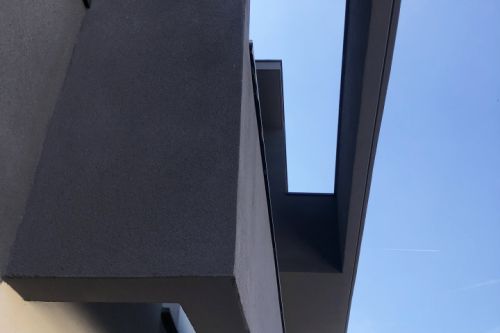 Des poutres qui marquent une « génuflexion » assurent la liaison des façades et signalent, par un effet de perspective, la fonction dédiée à ces espaces.
