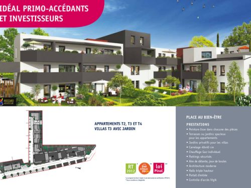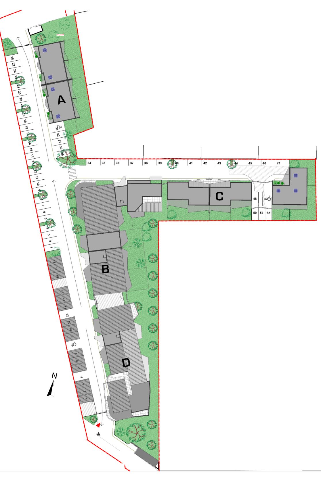 Les trois parties du terrain ont une faible largeur. Il en résulte une organisation linéaire qui libère les espaces verts au SUD-EST destinés à une aire de jeux commune et aux espaces verts privatifs.