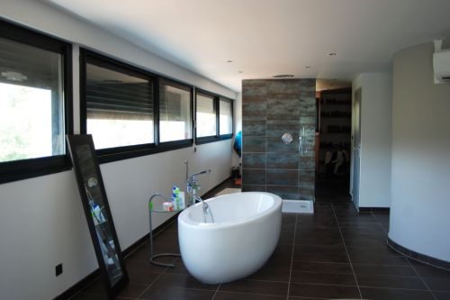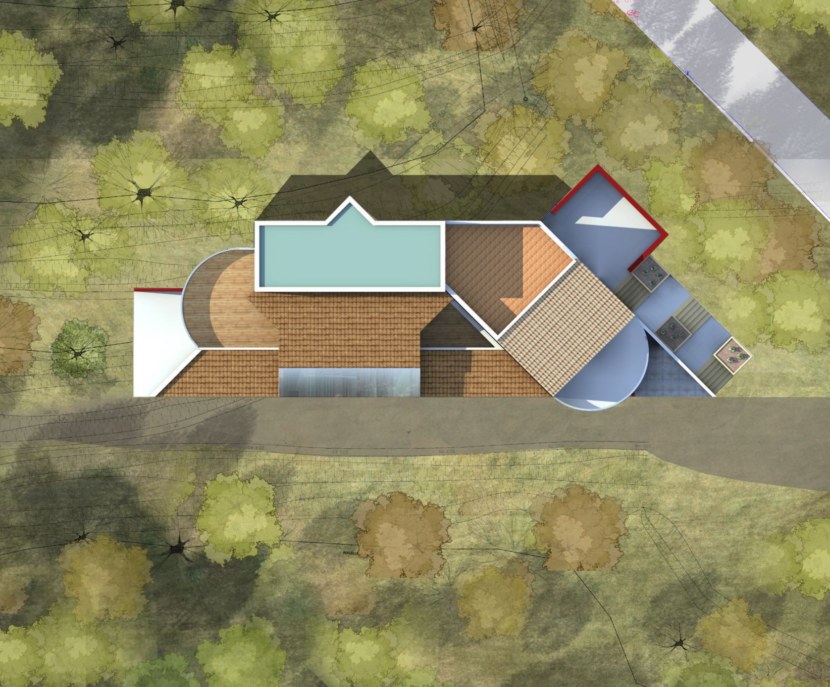 L’arrondi des murs de l’extension à l’Ouest est la forme qui convient le mieux pour concilier l’adjonction d’un volume à une façade en angle obtus. La terrasse de l’extension à l’Est reprend le même arrondi pour une meilleure cohérence en plan de masse. Ces formes arrondies apportent un « peu de douceur » à la construction d’origine aux formes très angulaires.