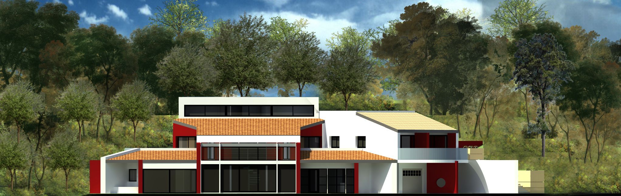 L’architecture reprend le vocabulaire du projet d’origine (grandes baies vitrées, toiture en tuile, enduit ocre clair…) afin de conserver la mémoire des lieux (réalisé par l’architecte M. Pépiot). La partie arrière du volume central, sur une largeur de 4,33 m, est surélevée dans le but de permettre la création de 3 châssis vitrés. Ces ouvertures offrent davantage de lumière zénithale à l’étage et permettent la vue sur le jardin depuis la passerelle qui conduira au solarium.