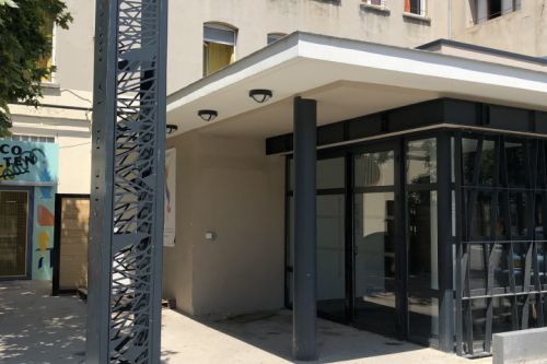 - deux cheminements en decks en biais, outre leur fonction de mise en liaison du mail avec l’espace fontaine et l’accès depuis la rue Francis de Pressensé, annoncent le cône de projection du futur cinéma sur le mur mitoyen,