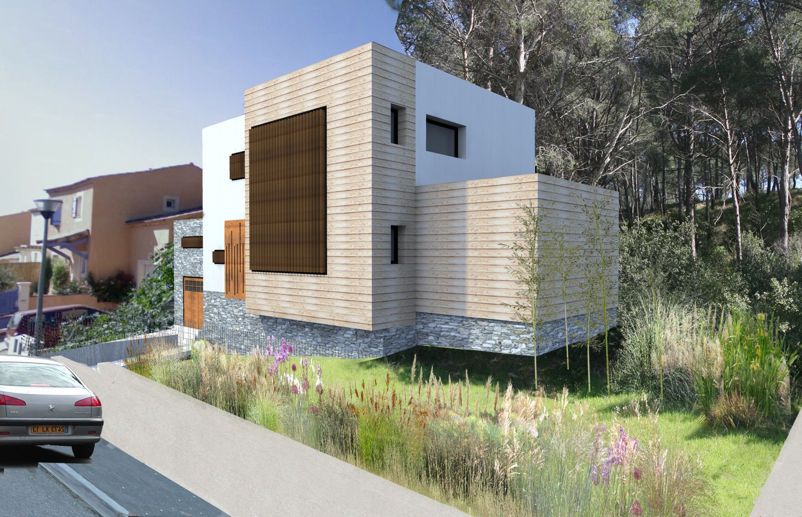 Le vocabulaire architectural emprunte au style contemporain, un toit terrasse, des couleurs claires, le rôle important de la protection solaire par un mélange brise-soleil/casquette de protection et un jeu de décrochés de façades entre les différentes parties de la maison.