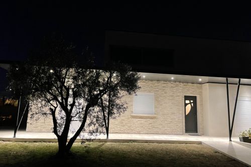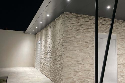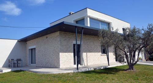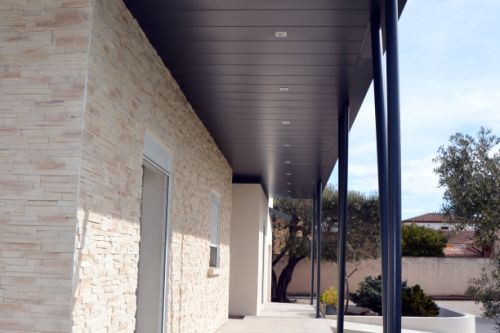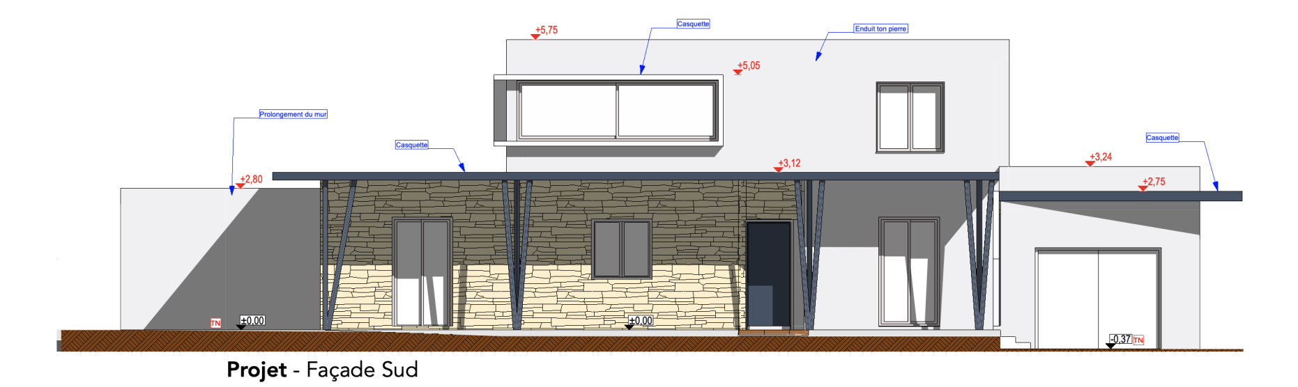 Cette casquette couvrira également la terrasse existante depuis le séjour. Elle se voudra contemporaine avec un parement en pierre en habillage des parties inférieures des façades Sud et Ouest.