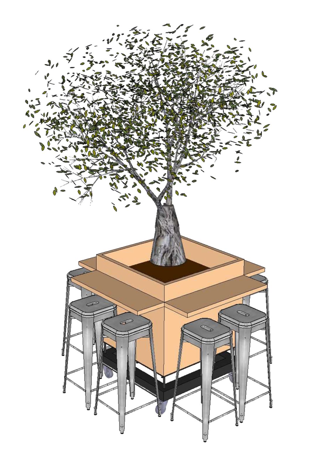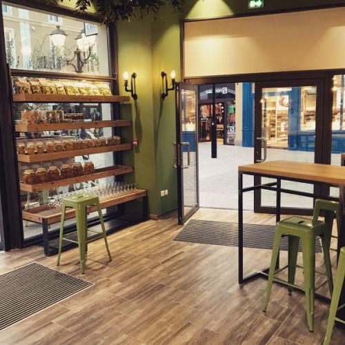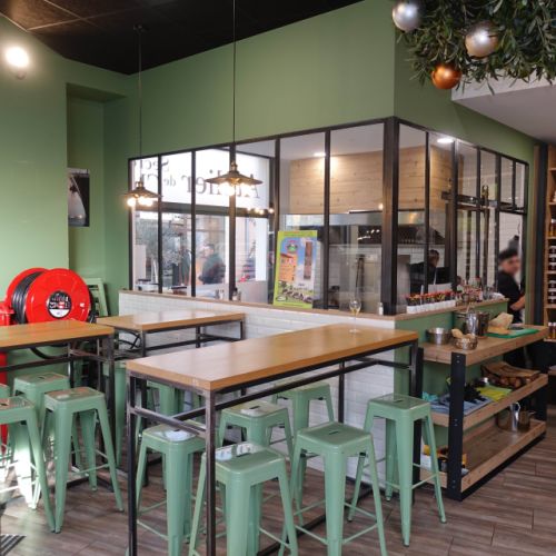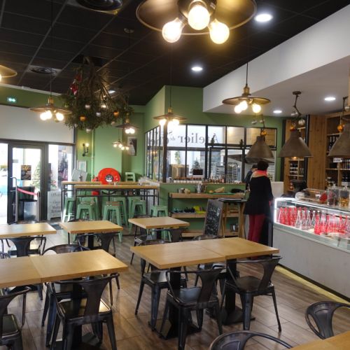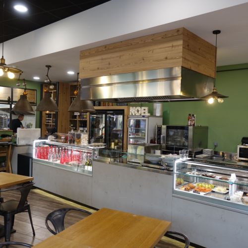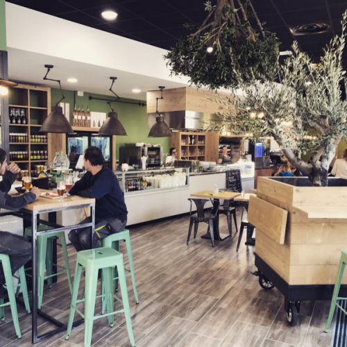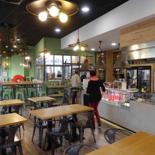 Le restaurant s'organise autour d'une longue banque d'accuueil permettant la préparation des plats et services en relation direct avec le public. La zone des préparations chaudes est mise sous verriére afin que le public suive en direct l'élaboration des plats. Les couleurs, décorations sont orientés sur le théme de l'Olivier.
