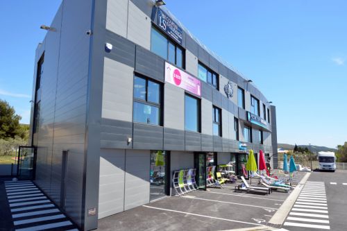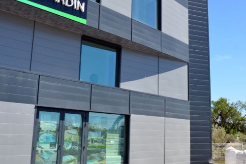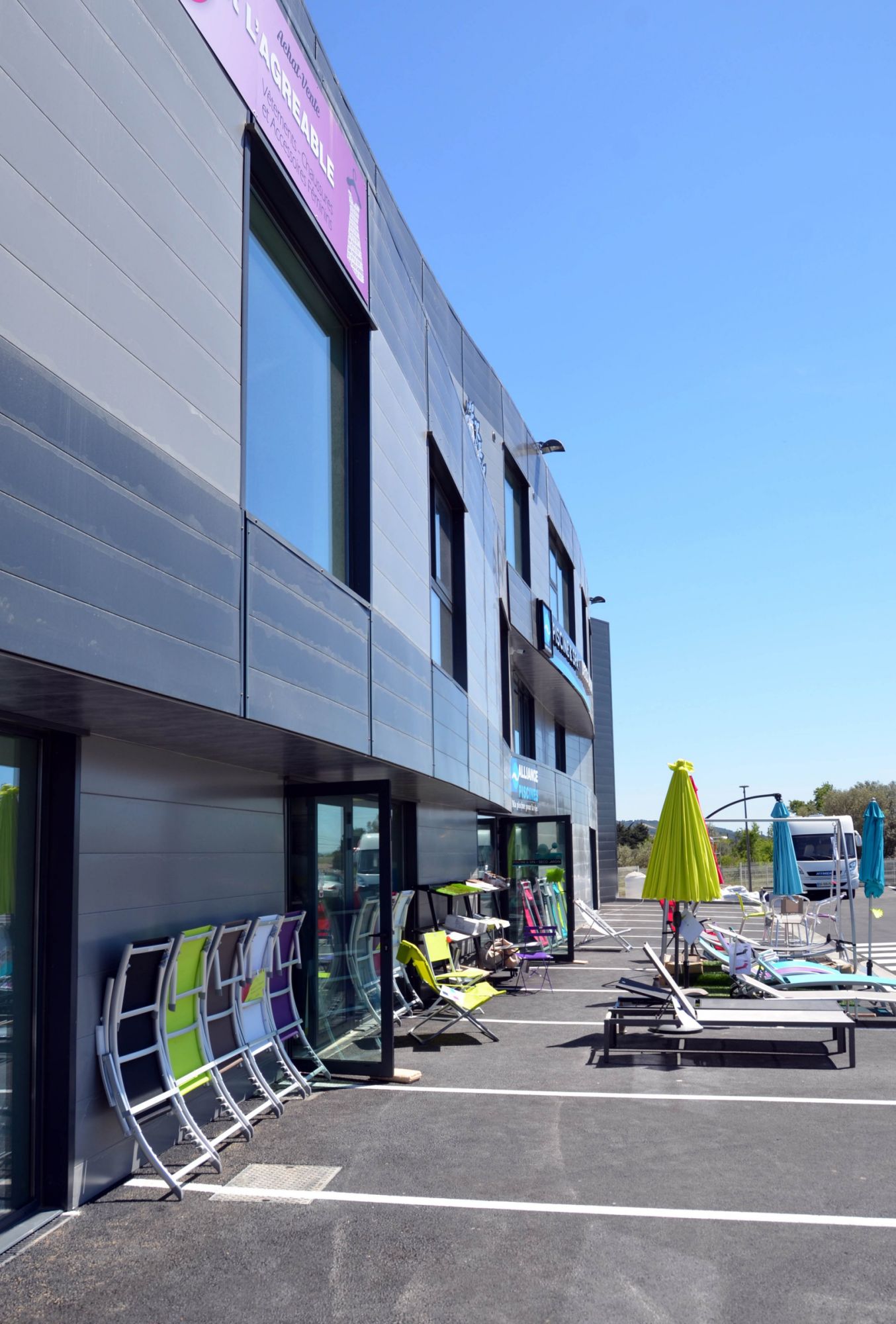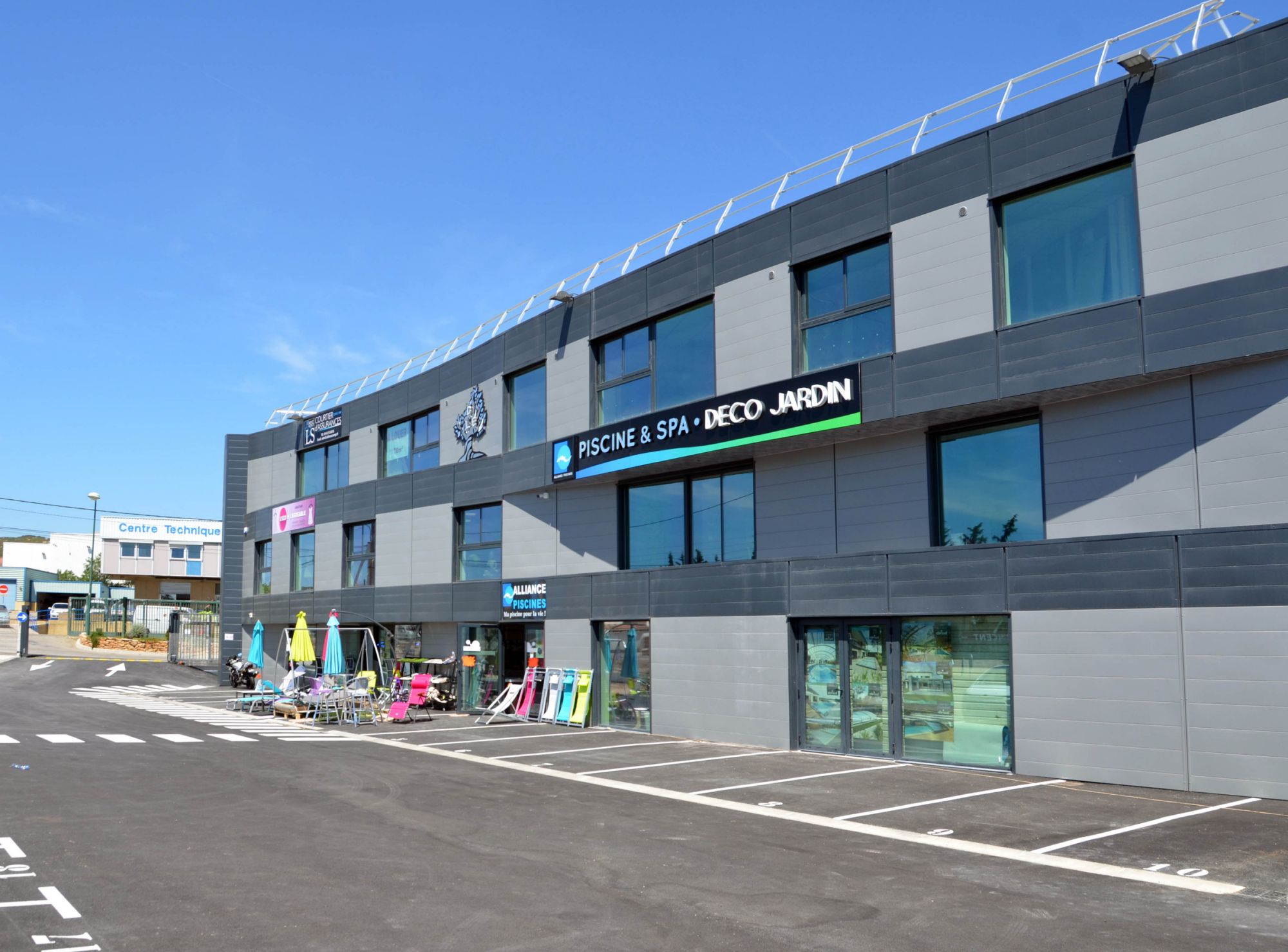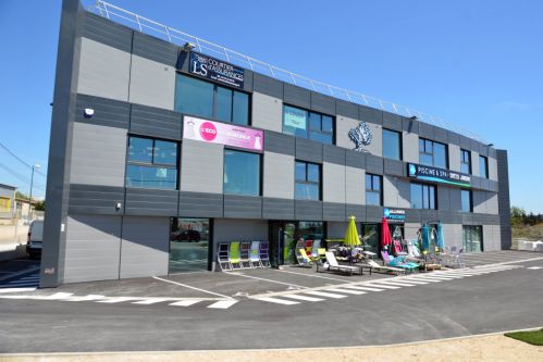 Une visibilité permise par la création d'un volume triangulaire de grande hauteur (environ 10 m de haut). Pensé à l'image du logo en forme de vague du fabricant de piscines, la façade principale sur la rue est structurée horizontalement par les trois niveaux aux ondulations croisées.