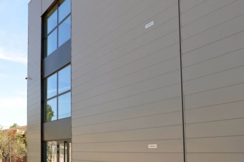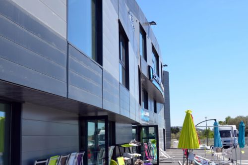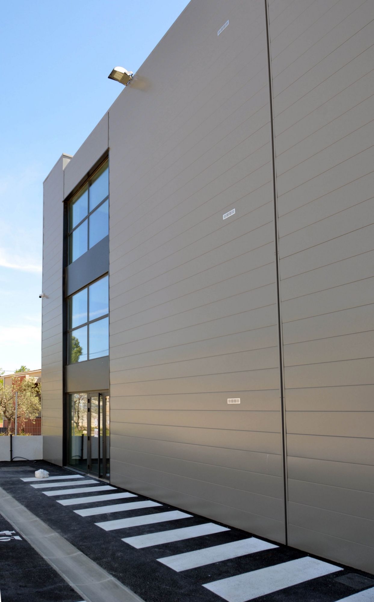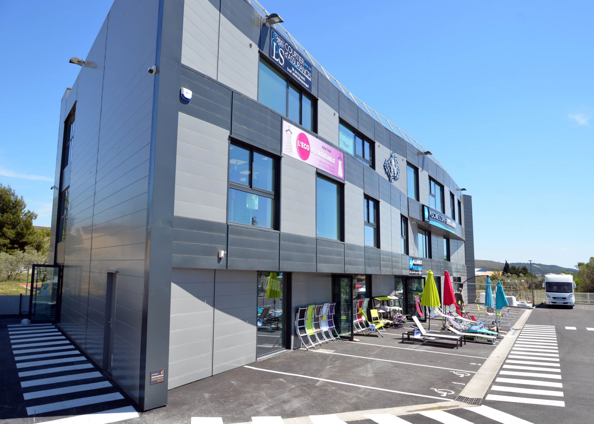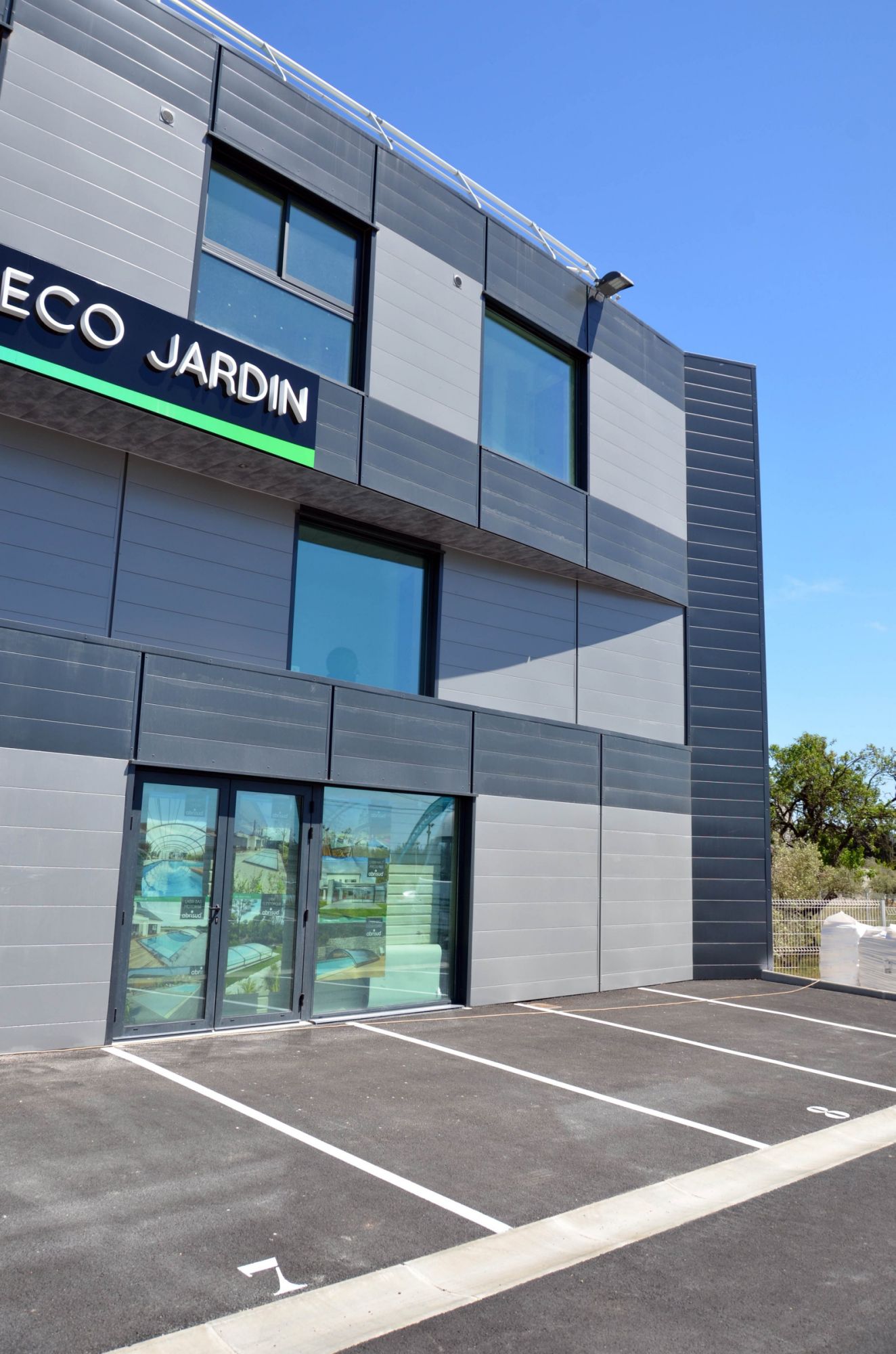 Une visibilité permise par la création d'un volume triangulaire de grande hauteur (environ 10 m de haut). Pensé à l'image du logo en forme de vague du fabricant de piscines, la façade principale sur la rue est structurée horizontalement par les trois niveaux aux ondulations croisées.