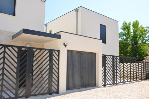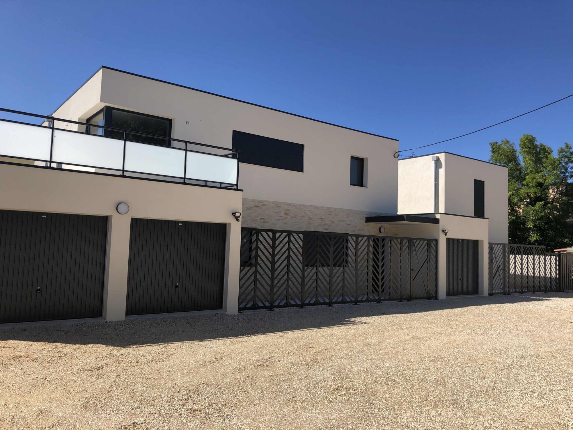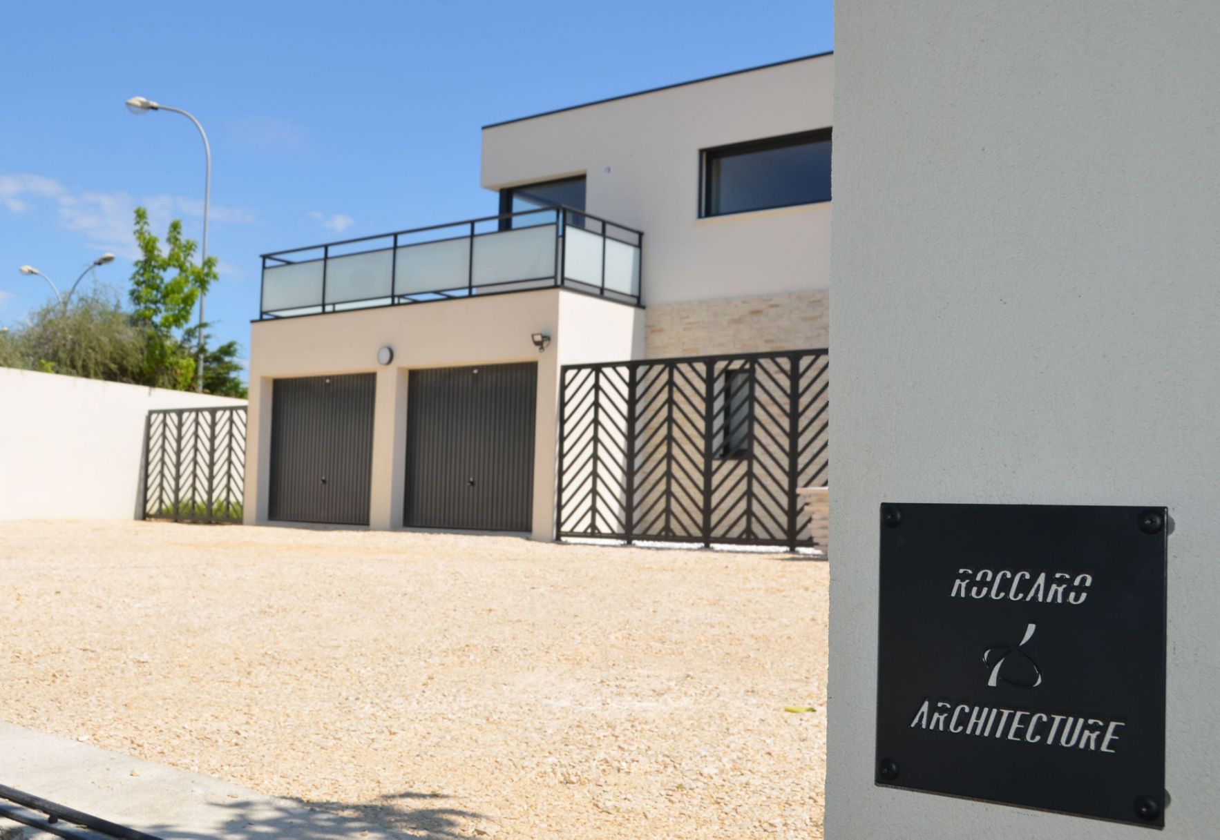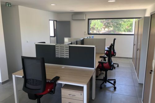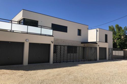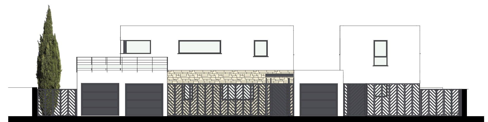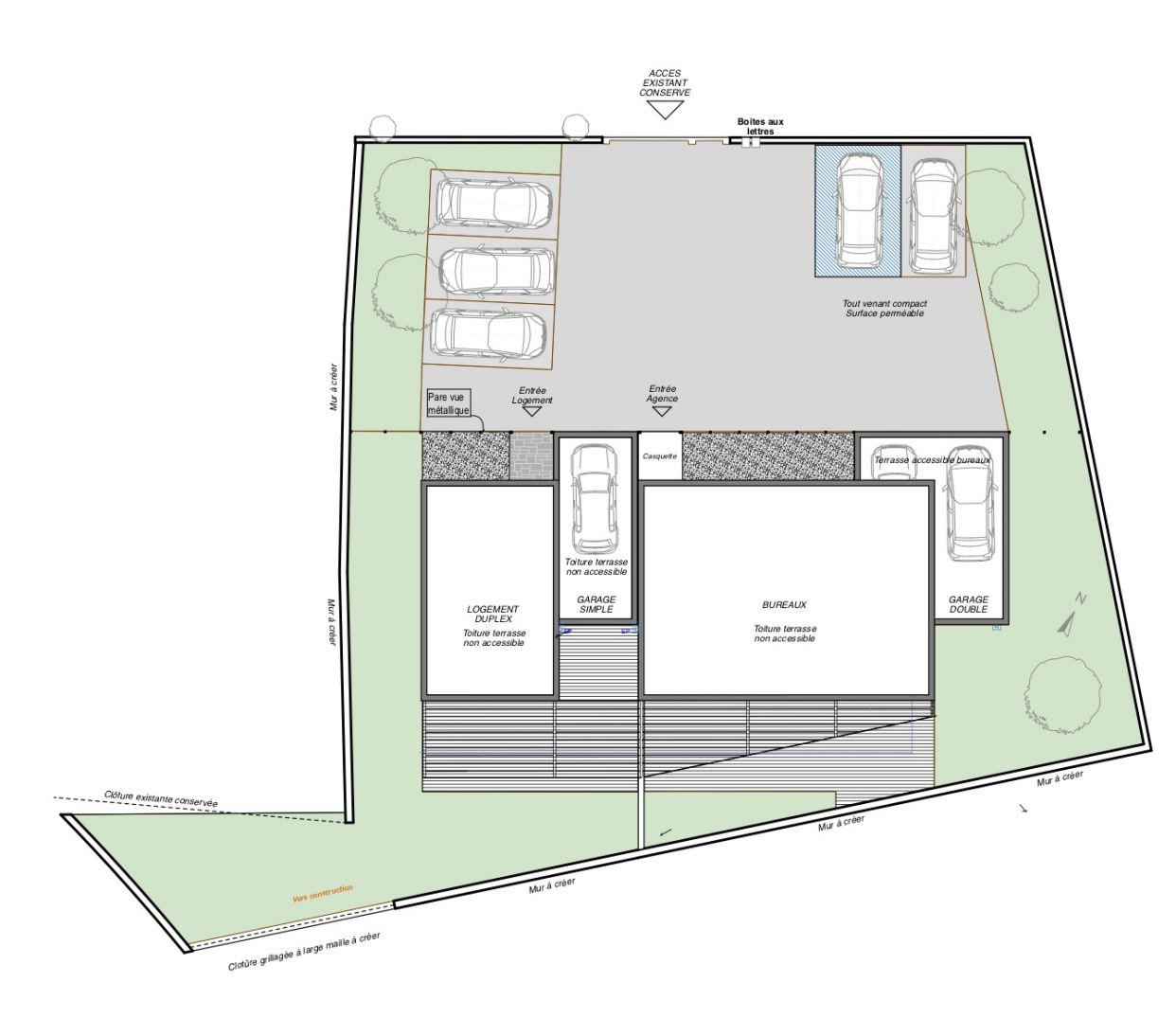 Le projet traite de la création d’un bureau de géomètre et d’un T3 locatif tous les deux en R+1 sur un terrain quasiment plat. Le futur ensemble construit s’organise en retrait par rapport à la limite nord de la parcelle dans le but de laisser un espace de parking pour la future activité. Un jeu de retrait est créé entre les garages et le bureau et le logement afin de protéger l’espace habité de l’espace de parking. Un claustra métallique en façade nord vient compléter ce jeu de protection. Au sud, le logement sera pourvu d’une terrasse surmontée d’une pergola pour créer un confort d’été. De même pour la partie des bureaux. Les retraits des parties de vie permettent la création de petits patios ou sas d’entrée permettant de protéger la construction de la zone parking.
