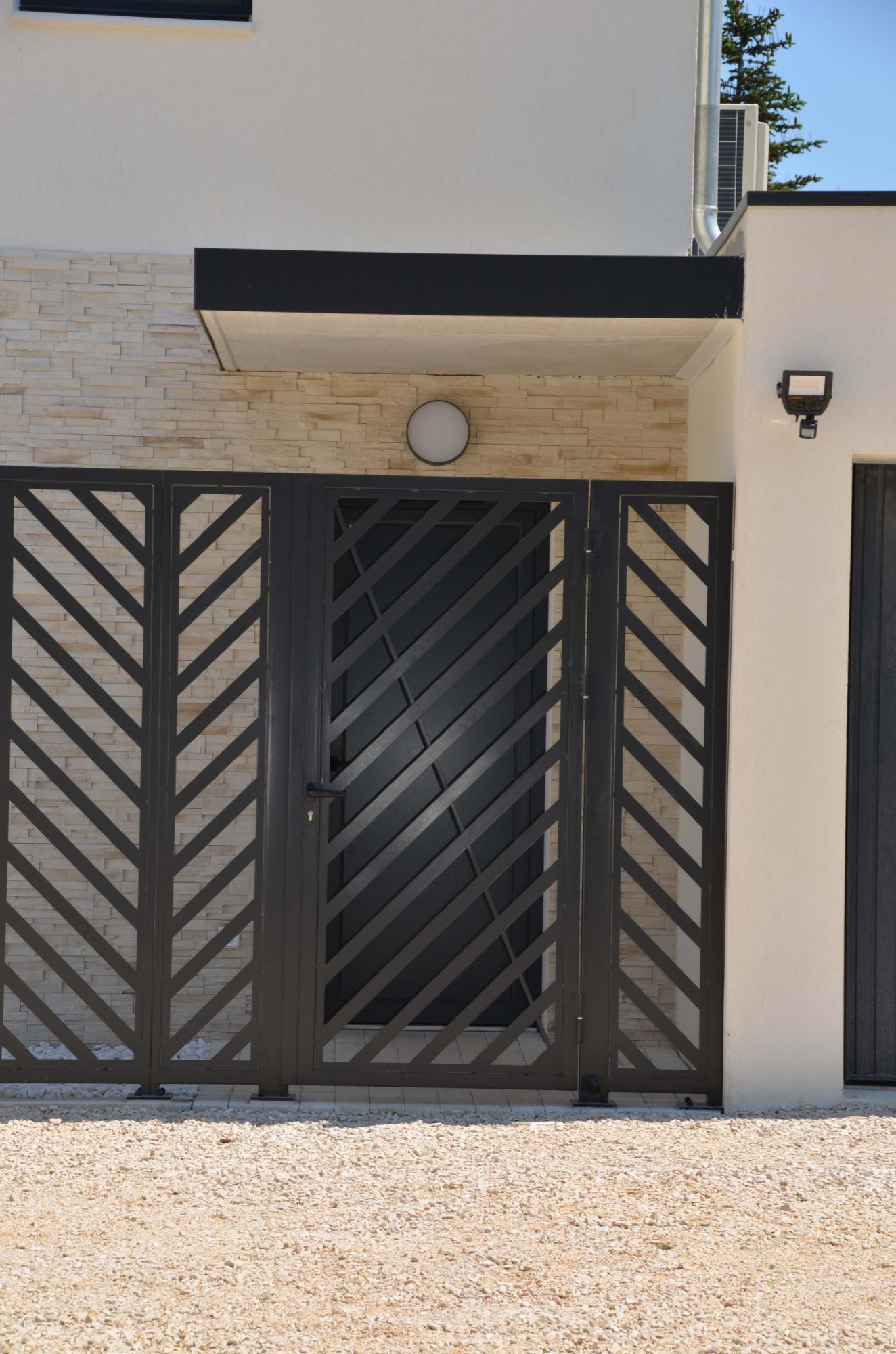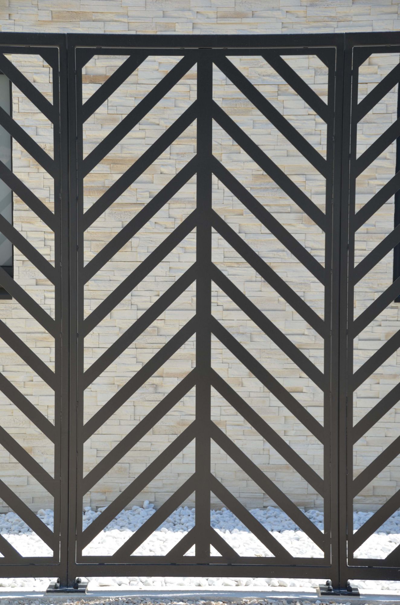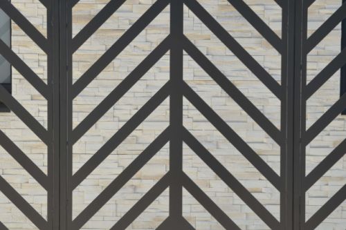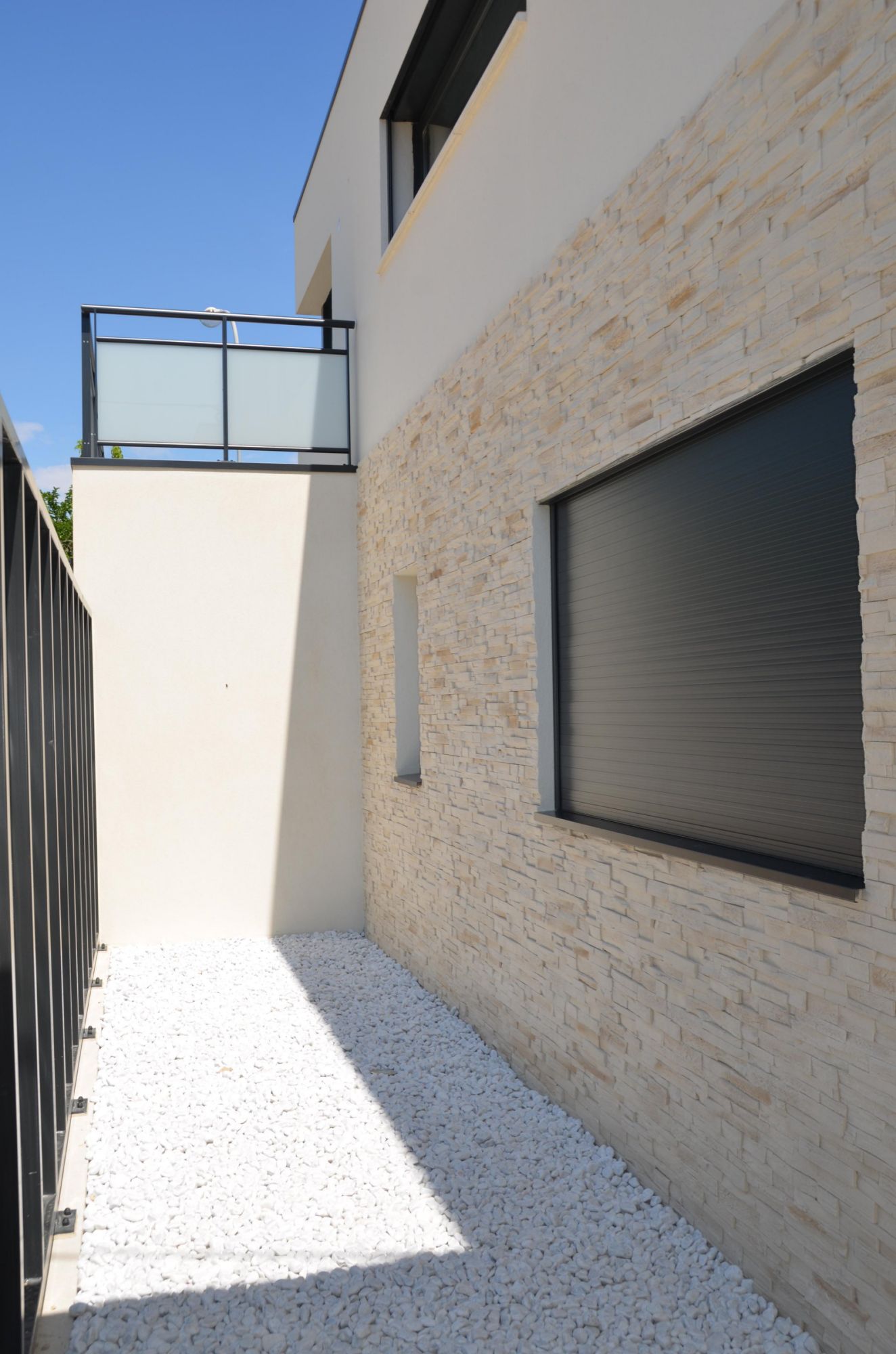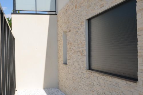 La partie basse des bureaux est pourvue d’un revêtement en pierre dans le but de rappeler le lien du travail de géomètre avec l’élément naturel. Et d’apporter un cachet à la construction en contraste avec les menuiseries métalliques.